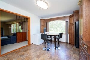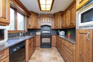 The remodelled kitchen offers oak cabinetry and granite countertops, opening to a spacious dining area with built-in china cabinets and a desk. A large living room provides space for gatherings.