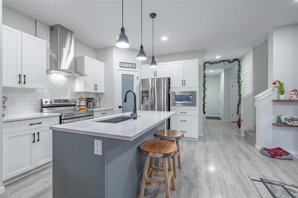 The bright open-concept main floor showcases soaring ceilings and oversized windows throughout the living and dining areas. The chef-inspired kitchen features quartz countertops, sleek cabinetry, built-in appliances, and a generous island ideal for both everyday meals and entertaining. Patio doors lead directly to the backyard for seamless indoor-outdoor living. A convenient main floor bedroom and full bathroom provide added flexibility for guests or multigenerational living.